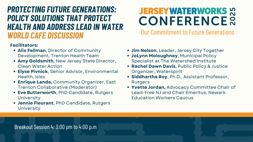 12/11/25: Eve co-led a session on protecting NJ children from waterborne lead in their schools alongside The Watershed Institute’s JoLynn Moloughney and Jersey Water Works’ Heather Sorge at the Jersey Water Works 2025 Conference.